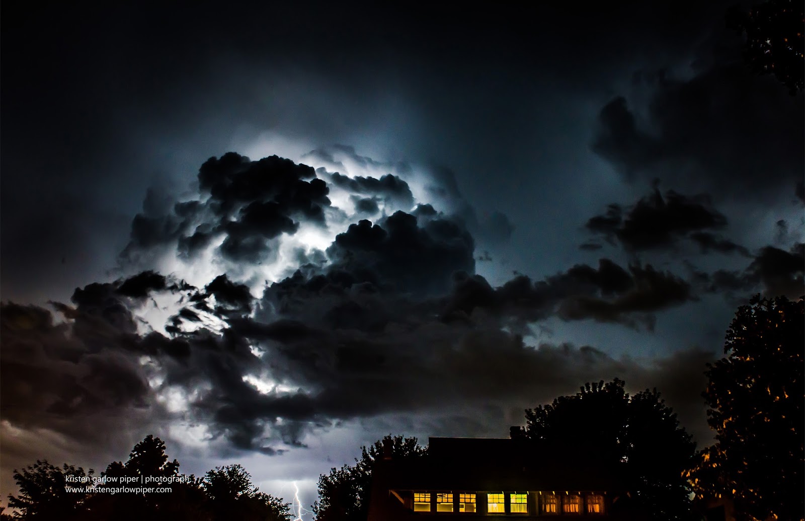 Photo details: Kristen used a standard night shot/tripod with cable release - ISO 100 - Shutter open 30 sec - 1/100 shutter speed. She said storms had been building all evening with the lightning starting around 10 p.m. She shot it with a Nikon D7000 and a Nikon 24-70 lens.