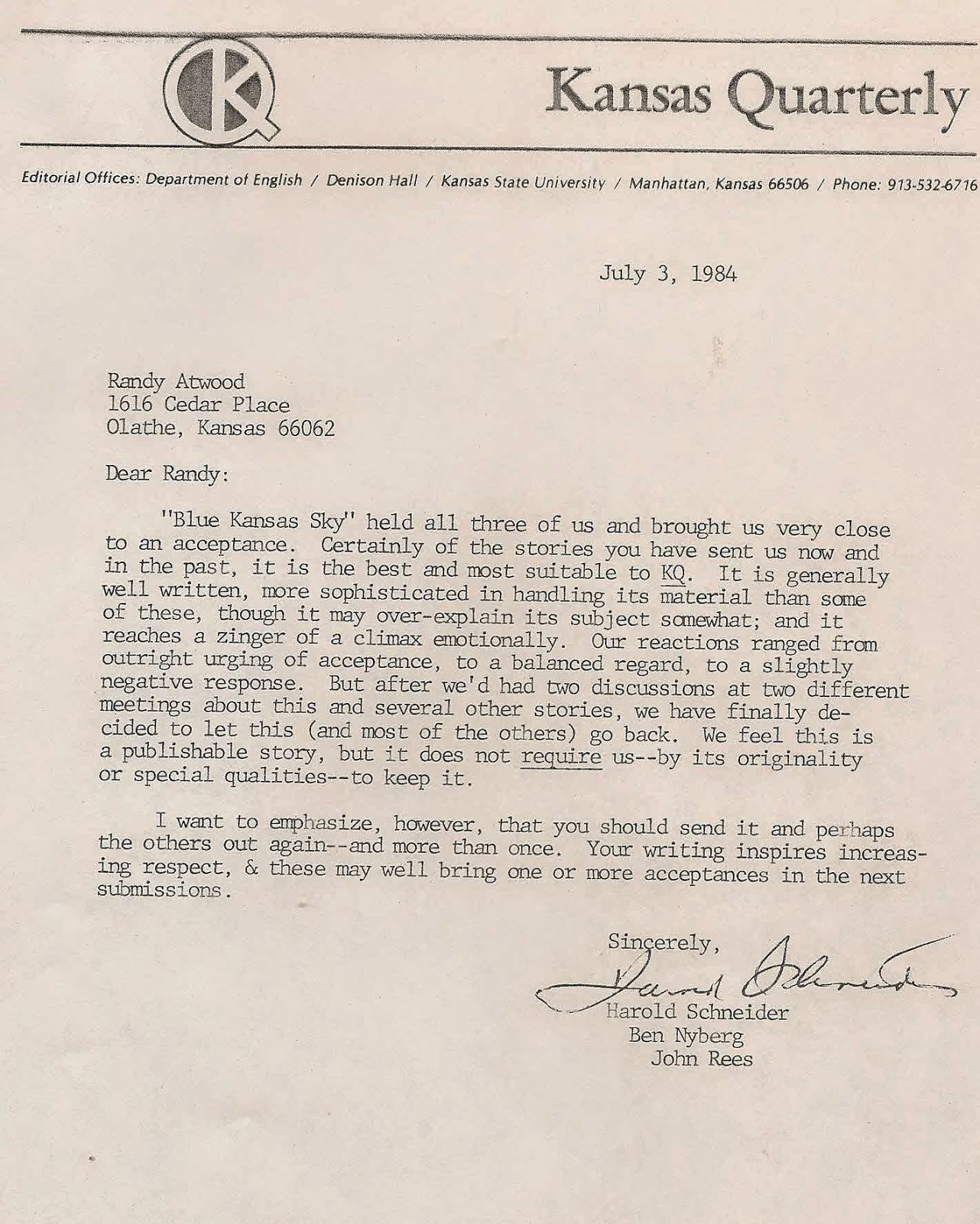 includes stories that have been rejected. You had to submit your proof of rejection along with your story. I was hoping they would also print the rejection. My story "Blue Kansas Sky" is number five in this collection. It was rejected by the defunct Kansas Quarterly. It would have meant so much to me in my youth to have had that story accepted. Wasn't to be. Hope you'll check out me and my other former rejectees. If you use the Look Inside function, you can read the first four stories and part of Blue Kansas Sky. If you just want to buy Blue Kansas Sky, you can find it by itself, here.
