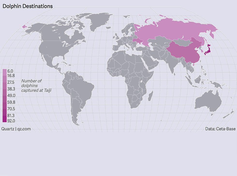 One website, Ceta-Base, tracks captive cetaceans and documents about where some, but not all, Taiji dolphins go. There were about 300 live captures in Taiji in 2013, according to the site, but information only exists on about half of those animals. Here’s the count: 92 dolphins were transferred to Japan, 36 went to China, 20 to Ukraine, 11 to Russia, six to South Korea, and five to Vietnam.