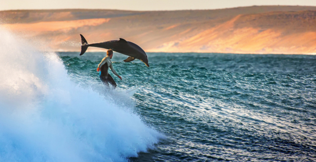 Professional photographer Joel Coleman was taking images of surfers at dawn when the dolphin appeared and began sharing the waves with the surfers.
