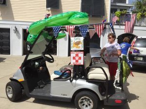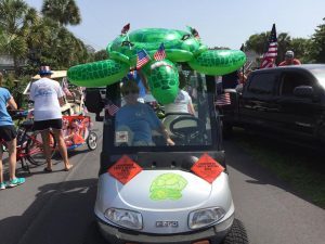 Meantime, I’m enjoying this view of the Atlantic 600 miles north of home, but I do miss the annual tradition of the Isle of Palms Independence Day golf cart parade. My family and friends have a grand time decorating my little golf cart and joining the caravan of neighbors and visitors cruising down Ocean Blvd admiring everyone’s festive decorations. Here are a couple of fun photos from a past July 4th event at home with my Island Turtle Team friends.