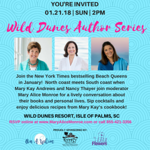 I’m delighted to welcome New York Times bestselling authors Mary Kay Andrews and Nancy Thayer to my island town for the Wild Dunes Author Series, January 21st. I’ll be the moderator of this lively conversation about beach books and personal lives. We’ll sip signature cocktails and sample delicious recipes from Mary Kay’s cookbook! It’ll be good fun just between friends in this North Coast meets South Coast literary event. Tickets are $40 each and includes signature cocktail, appetizers and a coupon toward purchase of a book. Silent auction includes a designer purse from Belk, a resort getaway package from Wild Dunes, and a Mickey Williams painting! CLICK HERE to RSVP online or call 855-421-3356.