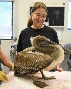 We drove the pelican directly to the Birds of Prey Center, which rescues, rehabilitates, and releases all types of birds, such as hawks, eagles, herons, owls, pelicans, and now shorebirds, too. The petite, young juvenile was thoroughly examined, treated for a wing injury and labeled as “failure to thrive.” She was likely late to hatch and didn’t get the time to learn how to adequately care for herself and eventually got left behind.