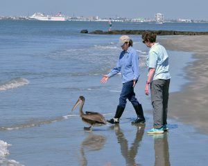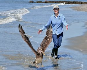 Then in April of this year, she was strong and well enough for release back to the wild. Mary and I had the honors of leading the pelican send-off, so we took to a place on Sullivan’s Island where we knew pelicans frequently gathered. But, on this particular day there were no pelicans–go figure! We let her out of her transport box to see what she would do, but this pelican had no desire to fly away or explore, no matter how much we encouraged her to take off. She only wanted to stay near the humans.