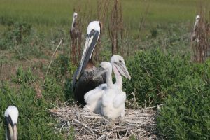 In June and July South Carolina’s shorebirds and seabirds have young chicks. In the spring thousands of brown pelicans, terns, black skimmers, gulls, oystercatchers and plovers start nesting on sandy islands and beaches along our coast. Their nests are simple scrapes in the sand or in the case of a pelican, a grass and stick nest on the beach. In April and May, these birds begin courtship behaviors on the beach of intricate dances that involve vocalizations, wing posturing, and bill touching. Male terns strut with a fish to lure a female to become his mate. Male pelicans advertise their territory by waving a stick that the female can use to build her nest. These birds mate on the beach and male terns continue to feed their partner small fish to strength the pair’s family bond. Both the male and female share in duties of incubating eggs in the nest and raising chicks. Parents need time to rest! While one parent is tending the young the other parent needs downtime and will relax at the water’s edge, often on a neighboring beach. This is precious time to re-energize for the next shift.