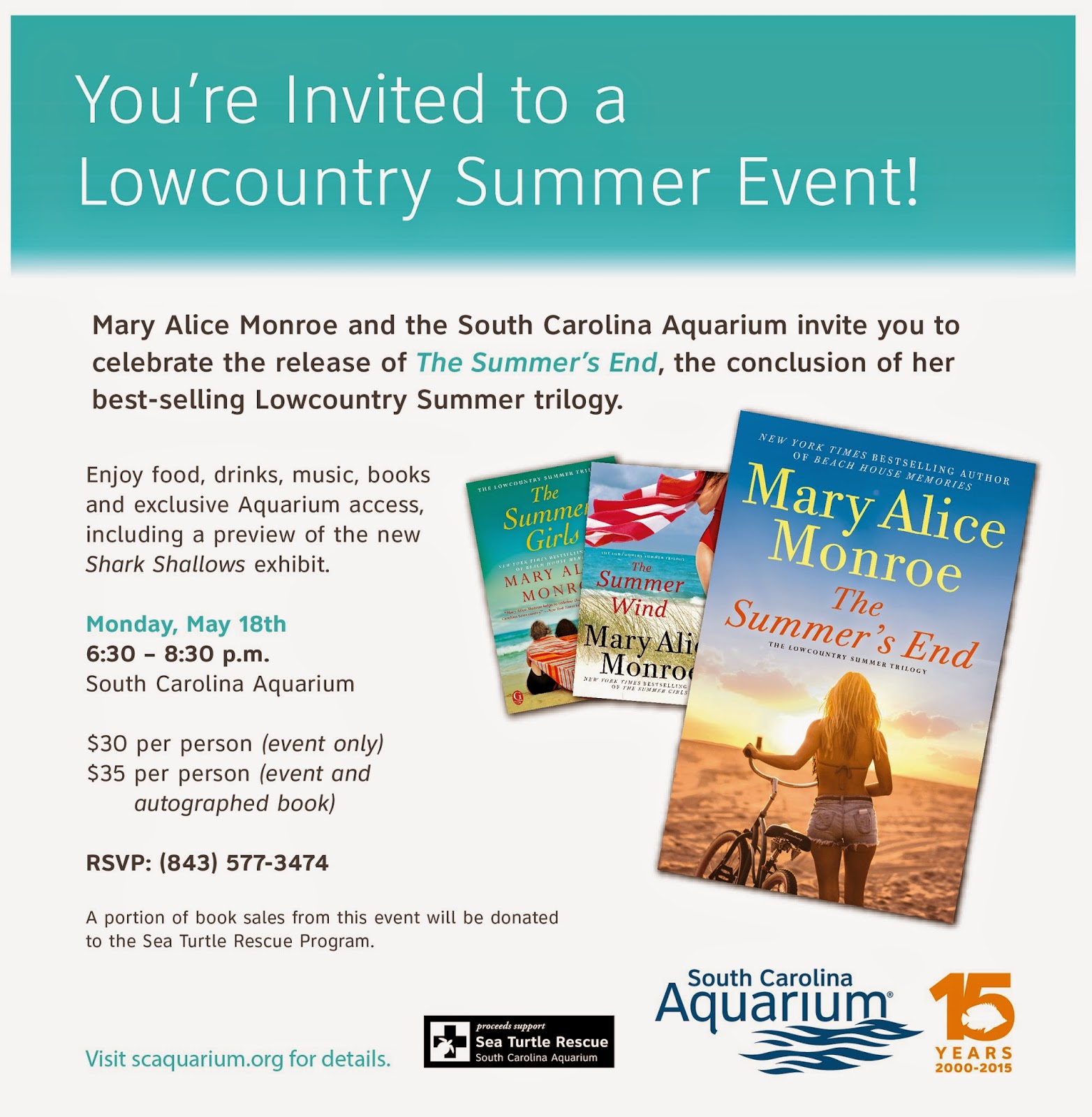 Meantime, I've been busy writing another book, doing media interviews, preparing for my book talks, and packing for the tour. My sister Ruthie will be my road warrior again for this 33-city book tour. Am I coming to a place near you? View book tour schedule now. Join me at an event. We'll have a great time! And, if you live within driving distance of Charleston, South Carolina... come celebrate the official book launch party for THE SUMMER'S END at the South Carolina Aquarium on Monday, May 18th, 6:30-8:30 p.m. I can't think of a more beautiful setting for a book party with wine, food, live island music, and most importantly, friends. View invitation here.