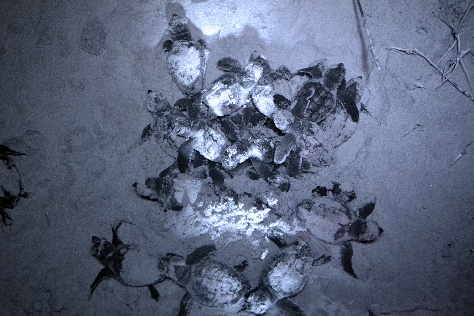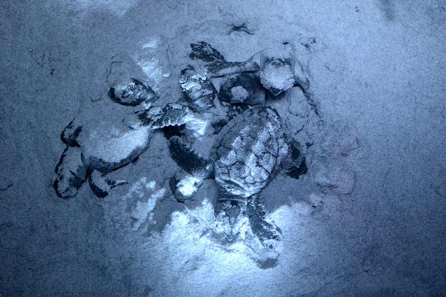 Over the course of an hour, or 2 or 3, it's like watching a birth. Little bumps appear on top of the sand. Like contractions, the circle heaves and slowly the bumps get larger and I can see dark tips of heads and flippers emerge as the group below pushes upward. We watch expectantly. Suddenly something triggers the group that it's time to go! With a great heave the 3 inch hatchlings begin scrambling out, climbing over each other, flippers waving, hatchlings tumbling down the slope, a hundred or more of them, in a mad dash for the sea. It looks like a pot boiling over, which is how it got the name "a boil" When this happens, the turtles are healthy and vivacious and as a group they have a better chance at survival, fanning out across the beach, following the rules of predator glut.