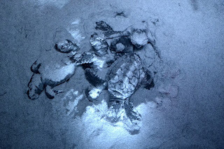 Along the southeastern coast we are in the hatching part of the sea turtle nesting season. Last night I went out to the beach on Isle of Palms, SC with my fellow Island Turtle Team members. Sitting on the sand under a foggy moon, being bitten by vicious beach ants, we watched as a loggerhead nest slowly rose to a boil. When that happens, the loggerhead hatchlings, already free from their eggs, begin digging as a group and rise together like an elevator from 20" down. At the top they rest for awhile.