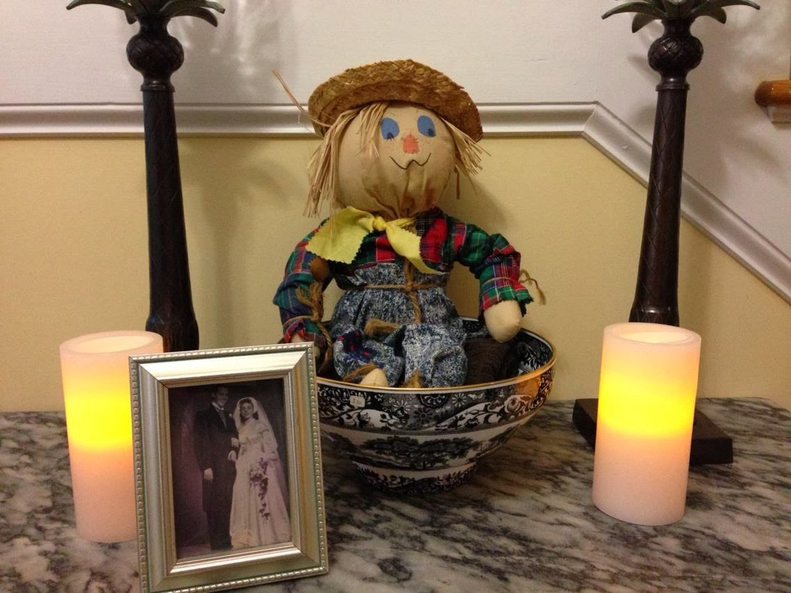 In the box marked "Halloween" I spotted a raggedy scarecrow at the bottom. A sad, neglected thing. My heart clenched at seeing it again. This decoration once belonged to my mother. Late in life, in an uncharacteristic gesture, (the mother of ten children, after we all left she rarely decorated) she had purchased this scarecrow at some local store. For some reason I can't fathom, she really liked it and put it out every fall in the small condo she'd retired to after Daddy died. When she came to my house to live for the final months of her life, she brought this scarecrow with her. I inherited it by default. It wasn't an antique or coveted piece of silver or jewelry. I don't know why I kept it. I'm a pack rat, I suppose... I got teary eyed, of course, seeing it again as memories rushed.