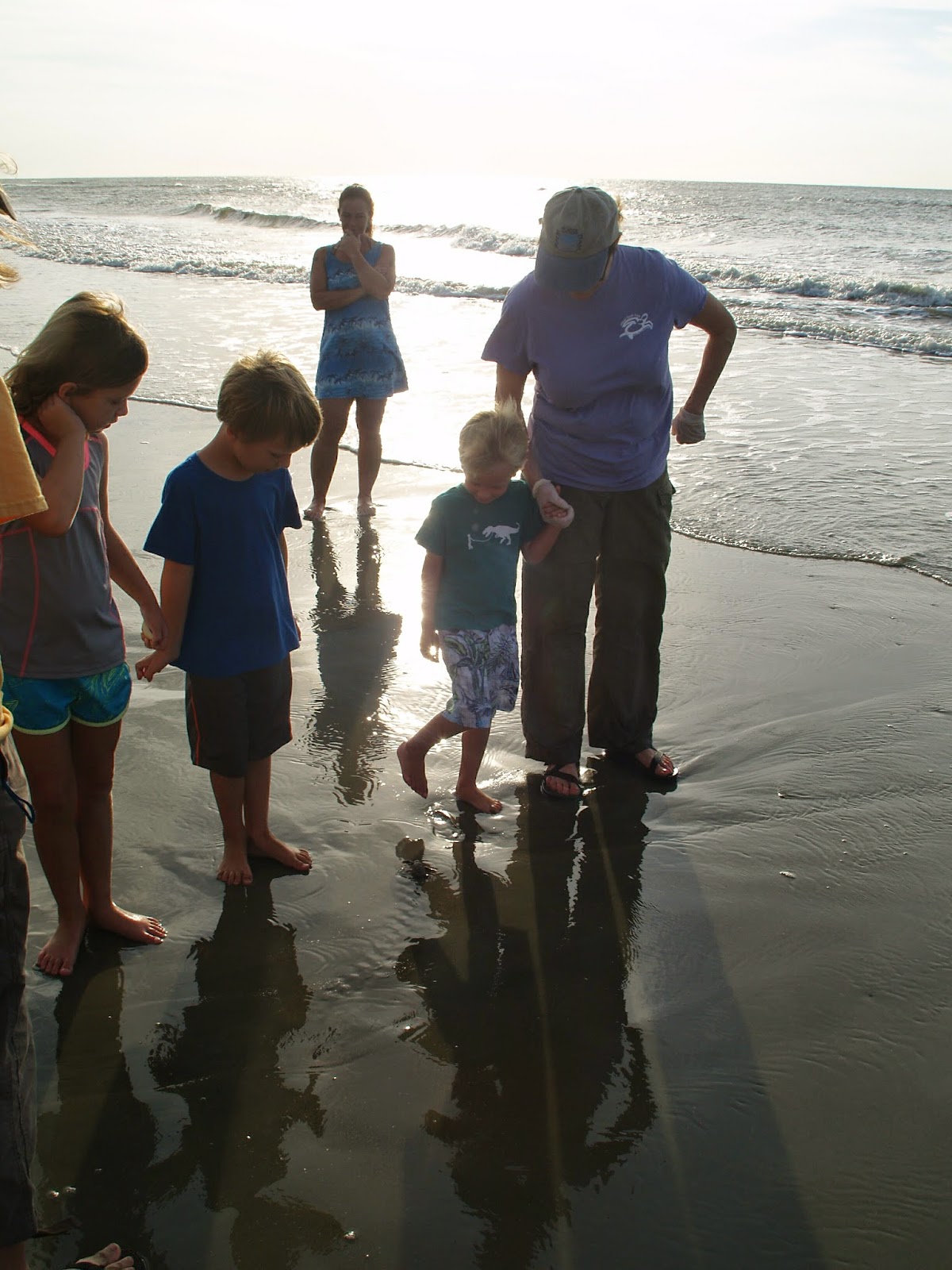 On the small patch of beach below the bridge a father and son were surf fishing. Farther away, closer to The Boat House, four young children played. The dolphins drew very near them along the shore, to their utter delight. Curious, I walked closer toward them, enjoying the sight.