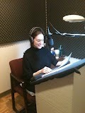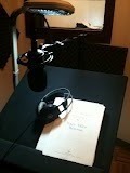 The recording boothThe routine is: I get picked up at the Inn and arrive at the Studio before 9 am. I wear soft clothing, no jewelry or make up. I don’t drink coffee during the day as it dehydrates or soda while reading as it makes the stomach bubble and burp. Instead, I drink warm or hot water with lemon. It’s important to keep the throat hydrated during the recording. My director and engineer are in an outer room with the script and computers, and I go into a second interior room behind double doors that is padded for sound. There is a small lectern, a bright light, and a microphone, earphones and my script. First we set up my mike and volume. After that, I wait for the engineer’s signal from the window. When he waves his hand, I begin to read.