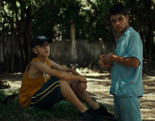 Now that we know the setting, we can understand "Jauría" and how it gets away with many mysteries. Its premise is around two teenage boys. One is Eliú Méndez (Jhojan Stiven Jiménez), hardened, sad, but with deep understanding behind his eyes. The other, just as hardened and sad but far more nihilistic, is Maicol Andrés Jiménez (whose name is the same actor's name) going by the nickname El Mono, which is a term meaning one of two things, or both: "blond," which even though he's technically not he's still light-eyed and light-skinned and that counts as blond in Colombia; or, "monkey." Eliú and El Mono stop a motorcyclist, kill him with a machete, ride out on their own motorbike with his body to hide it until whoops it falls off, and drag it to a cave (at least we think they do; the film isn't linear and it isn't clear what's real or imagined) which has an opening above some corner where sunlight may pour through. We're never told how the boys are discovered to have committed this crime, only that they are indeed discovered. They're each sent to separate "rehabilitation centers" around Tolima. Despite they're initially not being sent to the same center, they're nevertheless soon reunited in the place Eliú originally ended up in.