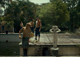 Ramírez Pulido throws into this film a character named Álvaro (Miguel Viera), a middle-aged man, who despite his own criminal background is serving time by mentoring the boys in this center and providing psychological and physical therapy. Álvaro claims he himself was abused by his father, and, in that sense, is able to connect to the young men. They're all either fatherless or, like Eliú, have been abused by their fathers and taken after them. Some have killed, and all have stolen and participated in drug trade. The man frequently compels the seven boys to, while they're not cleaning an abandoned mansion's pool (which we realize later is mere slave labor so that some contractor doesn't have to pay), release their anger through psychically connecting to the earth around them. It's what keeps him sane. Álvaro's foil is the guard named Godoy (Diego Rincón) who insists that Álvaro's "softness" will rot the boys rather than rehabilitate them; castigation, mortification, humiliation, those methods are how you get people to stop doing bad things, because human nature is indelibly f&cked. Some kids just need to be frightened more to stop them from being criminals, but, underneath, we're all like the savage nature around us, like the volcano, ready to spew and kill at any moment. We have to clean up all this filth from the pool, cut down trees, and, because the film's Spanish title translates to "pack of hounds" we're to use our keen awareness of evil to chase it down and kill it. Godoy loves his truck whose backseat is a kind of pen into which he chains the boys when they must travel, blindfolded. In fact, the boys are usually always chained, and one time El Mono mysteriously escapes just to be hounded down by one of the actual dogs. Some rehabilitation.Hegelianism, Marxism, City of God //Where Perhaps Paradise is Much More Like an Unpredictable Garden