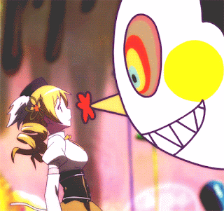 Its world in the fake Japanese city Mitakihara consists of magical girls or "mahō shōjo" (a trope in manga/anime) whom each make a contract with an Incubator named Kyūbey. This results not only in a single wish being granted but in a compulsion to fight and kill entities called "witches" which bring disaster through invisible labyrinths. Witches' labyrinths trap innocent people and cause them to harm themselves and others. We learn as the story progresses that witches were once magical girls who at some point turned to despair. They turned to despair for a variety of reasons. Due to finding out the devastating truth that all witches were indeed once magical girls, or because their wishes ended up causing more harm than good. Both and then some. A magical girl runs out of magic if she doesn't purify her "soul gem" (which is the locus of her mind-soul or kokoro, rather than it being in her body which is more like an empty shell used for combat). She purifies her soul gem with "grief seeds" she collects from defeating witches. The grief seeds of witches were once soul gems. See the cycling? It's this violent transformation of a hopeful magical girl into a witch that Kyūbey curates into energy. This energy is used to maintain the universe. Apparently, the universe is running out of heat due to entropy (or the idea that destruction is quicker than creation and therefore superior, and so time is not on the side of maintaining life).