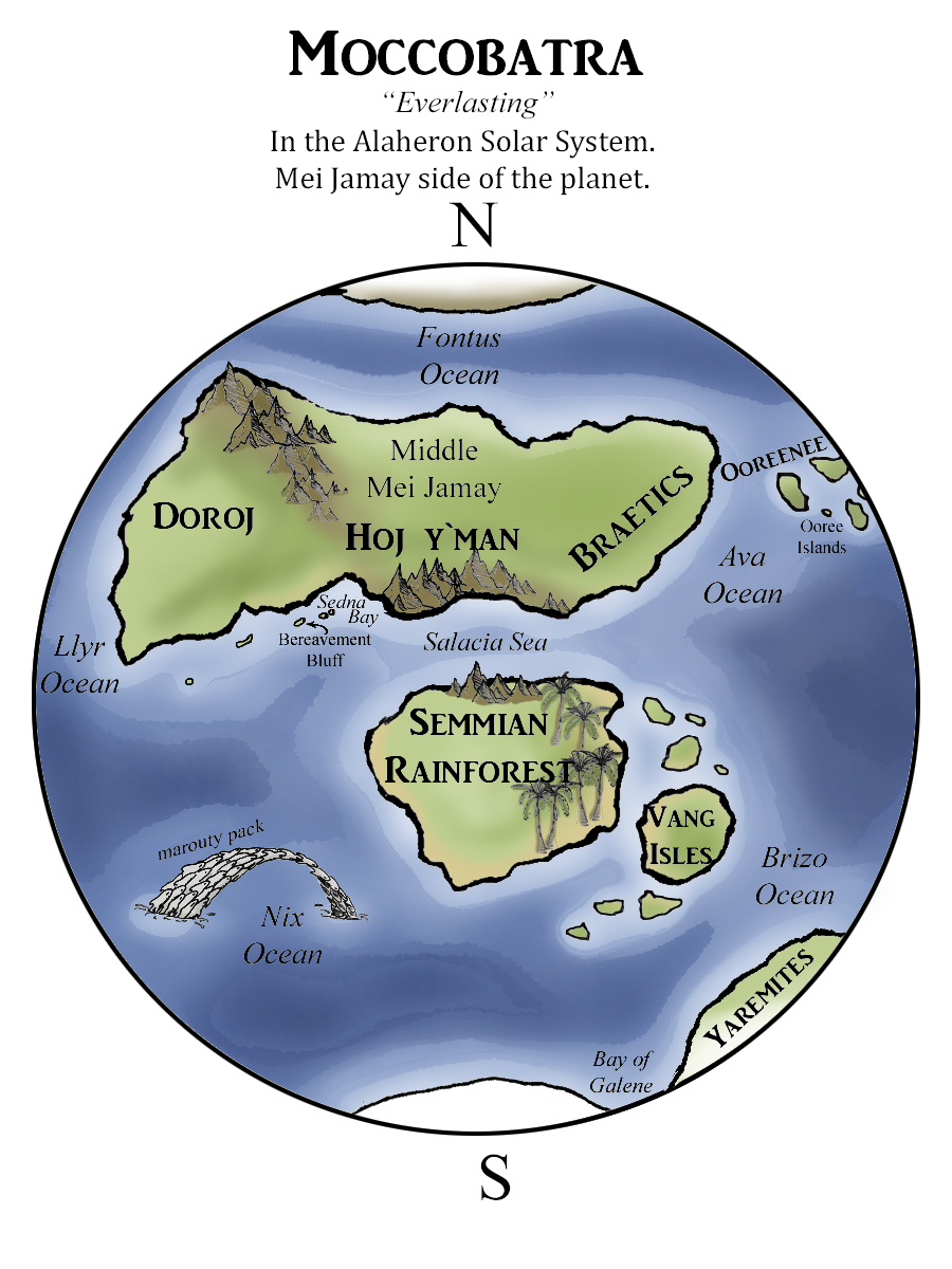 The Hoj y' man are identified by their blue skin, with hues ranging from periwinkle to indigo. They live in Middle Mei Jamay in the same hemisphere as Harrowbeth but on the opposite side of the planet. On their eastern border they neighbor the Doroj while on their western border, they neighbor the Braetics. A frequently-uttered slogan among this proud people: Car’ un em doy’ Hoj y`man deria, or Faith in the Hoj y`man nation.