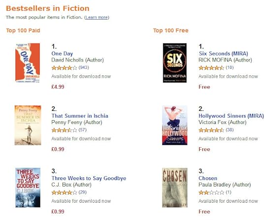 Which ones work? I’d say that ‘One Day’ and ‘Six Seconds’ both work brilliantly. The images are simple but striking and the text is completely readable (with the exception of David Nicholls’ name). In ‘That Summer in Ischia’ the colour scheme is too subtle and so both the image and the text are indistinct, as well as the text being very small. For Victoria Fox’s ‘Hollywood Sinners’ there is insufficient contrast to read the author’s name properly and the whole cover looks messy and cluttered. ‘Three Weeks To Say Goodbye’ is pretty good and ‘Chosen’ is another one that has faded and become indecipherable at this size.