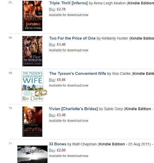 Which has now had approximately 100,000 downloads. It was #1 in the Amazon UK contemporary romance section and in the top ten of all free books on Amazon UK for several weeks. It didn’t reach quite the same heights on Amazon US but was comfortably in the top 100 for a month. It’s also had a good number of reviews during that time and sales of my other books have improved. But, for reasons I do not completely understand, it was not free everywhere and it is now only free at Amazon UK as far as I know. So it has also sold quite a lot of copies. In the last two months, my royalties at B&N have been around $800. And at Amazon, about $1500. That’s more than in the whole 18 months prior that Reckless Runaway and Tycoon had been on sale. About ten times more, in terms of Amazon sales alone (I had been selling a lot better at B&N before, for some reason).