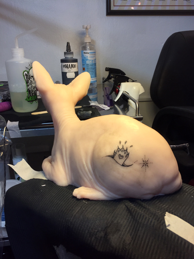 Oikealla oleva tassu on tatuoitu silikonista tehtyyn harjoituskissaan, kaikki muut A4-kokoiselle harjoitusnahalle. Silikonikissaan oli huomattavasti helpompi tatuoida kuin harjoitusnahkaan (mustetta on vaikea pyyhkiä pois, muovisempi koostumus). Oikeisiin ihmisiin en ole vielä päässyt kokeilemaan!