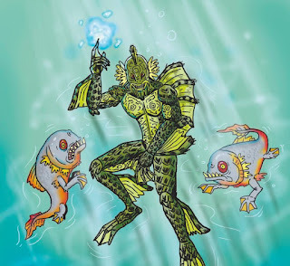 They are vicious and the only thing keeping them from attacking the surface is a fear and respect of man. They become loyal to Dracula. The Hucha Awqaq Suyu have developed their telepathy to create an enticing and alluring quality to help them in capturing their victims. Like the Yacuruna, they resemble green fish-like men with wide webbed feet and hands, ending in sharp claws. They have piercings and tattoos that mean certain things to their tribe. They have fish-like eyes, fins ad razor sharp teeth.