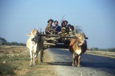 Naturally the oncoming traffic plots to do the same, and tranquility seldom reigns. Yet in the middle of it all, whole Burmese families plodded by on ox carts or old blue Ford or Dodge “buscars” with men and boys stuffed everywhere inside, standing hanging on the back and a dozen more piled on top. Invariably they all broke into wide smiles and waved madly as they wheezed past.