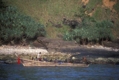 We drove over to the dock. Chan bought some betel in a ferry waiting room. The betel leaf in Burma is green, wide and round. They slathered it with paste and sprinkled a few betel nut pieces on top. The paste and nuts are bitter. They provide calcium. The leaf is a mild amphetamine.