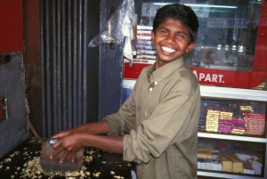 We bought a mango and tiny peanuts. My wife Mirja liked them better than the big ones back home, the way Roma tomatoes are tastier than fat round factory-grown ones. The guy fashioned a bag from a folded sheet of newspaper and scooped it full for thirty rupees. Which is, roughly, free.