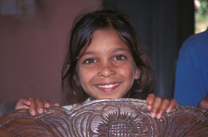 The youngest, a precious brown-eyed beauty, took shy refuge behind a hand-carved chair, only her head and hands visible. I may have been a stranger, but she offered a ready, open smile.