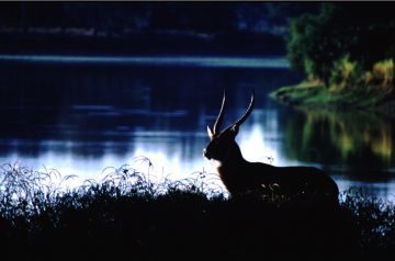 The grass in front of camp extends several hundred meters to the riverbank, and heat shimmers at midday. Waterbucks wander in twos and threes. Tiny cumulus clouds daub at the horizon under cerulean sky. Alone in camp we sprawl out careless, camera here, camera bag there, a pile of Wildlife and Africa Birds and Birding magazines over there.