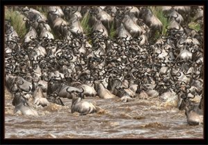 We are surrounded, swallowed up. The spearhead turns the riverbank to a seething, febrile froth, and in an instant, mayhem! Thundering and diving and rending noises, splashing and motion, bedlam you have never seen. Waves of beests hurl themselves over cliffs up and down the river. They press ahead. A half hour, a herd in motion, and then still more, no rear guard, ranks replenished over and over and then again.