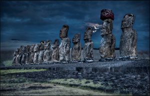 The gods went bowling that day in 1960, scattering the moais at Tongariki two thousand feet inland and dashing their ahu to bits. The Tongariki moais are giants, the island’s greatest achievement, but the heavens’ pique cast them like matchsticks onto the plain.