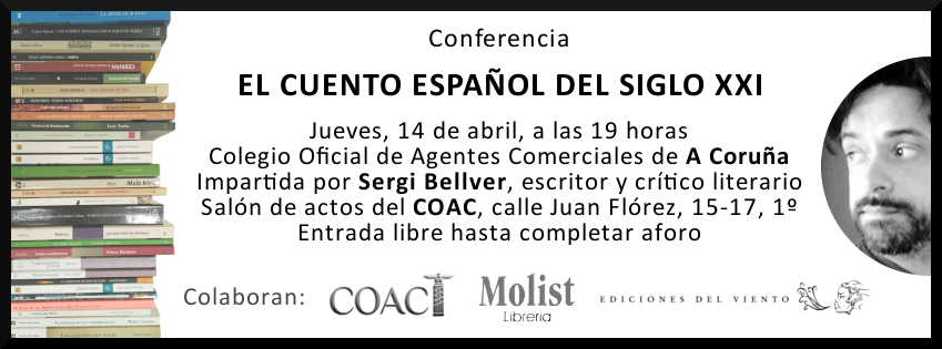 La tarde del jueves 14 de abril, en el salón de actos del Colegio Oficial de Agentes Comerciales de A Coruña, daré una charla abierta al público sobre el cuento español en lo que llevamos de siglo XXI. Comentaré las corrientes fundamentales del cuento contemporáneo español desde finales de los años 90 del pasado siglo hasta nuestros días, así como los autores y los libros de relatos que me parecen más relevantes en estos últimos tiempos, con el objetivo de ofrecer un mapa literario actualizado del género en nuestro país.