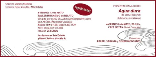 La tarde del viernes 6 de mayo, en el Caf�� Rist��n del Hotel Quind��s, los escritores leoneses Rafael Saravia y Noem�� Monta����s me acompa��ar��n en la presentaci��n de mi libro de relatos Agua dura (Ediciones del Viento, 2013). Ser�� a las 20.30 horas, en el n��mero 38 de la c��ntrica Gran V��a de San Marcos. Podr��n adquirirse ejemplares en el evento gracias a la colaboraci��n de la librer��a Valderas.