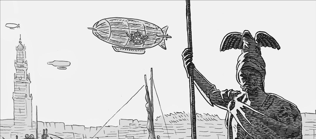 Tive o imenso prazer em fazer uma BD com o muito imaginativo Rui Leite, sobre personagens dedicadas em realizar uma valorosa e incrivel viagem em meados do séc. XIX. Pude desenhar vários locais do Porto, num estilo old-fashion com diversos elementos de um universo alternativo imaginado pelo Rui Leite. O exterior e o interior do Palácio da Bolsa foi o que mais me agradou desenhar, as paredes com entalhes de madeira e pequenas estatuetas algo luxuosas tornou o desenho algo rico de pormenores, e aproveitámos para adicionar um sistema de comunicação entre salas, entre outros elementos steampunkianos. Complicado já foi o Palácio de Cristal, com um jardim inglês frondoso e verdejante e com flores capazes de mastigar homens, e com rios de lava e pontes japoneses (e existe actualmente, no exterior do Pavilhão Rosa Mota, uma ponte japonês!). O momento alto da história teve lugar no Monte da Virgem, aquele monte com a antena radiofónica, na margem da Gaia. Ainda não visitei esse local.