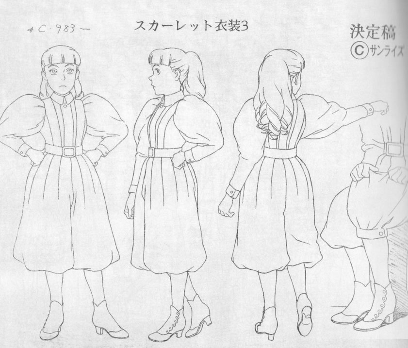 Além do mais a personagem lidava com as partes mecânicas dos aparelhos e estruturas e queria algo como uma farda fabril. A solução encontrei-a na personagem Scarlett O'Hara do grandioso filme Steamboy. Uma pequena variação e foi este o primeiro design: