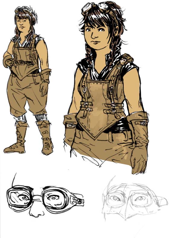 Comecei por definir a protagonista dando-lhe uma roupagem do pouco que sabia do steampunk-style, nomeadamente os "goggles" e o espartilho.