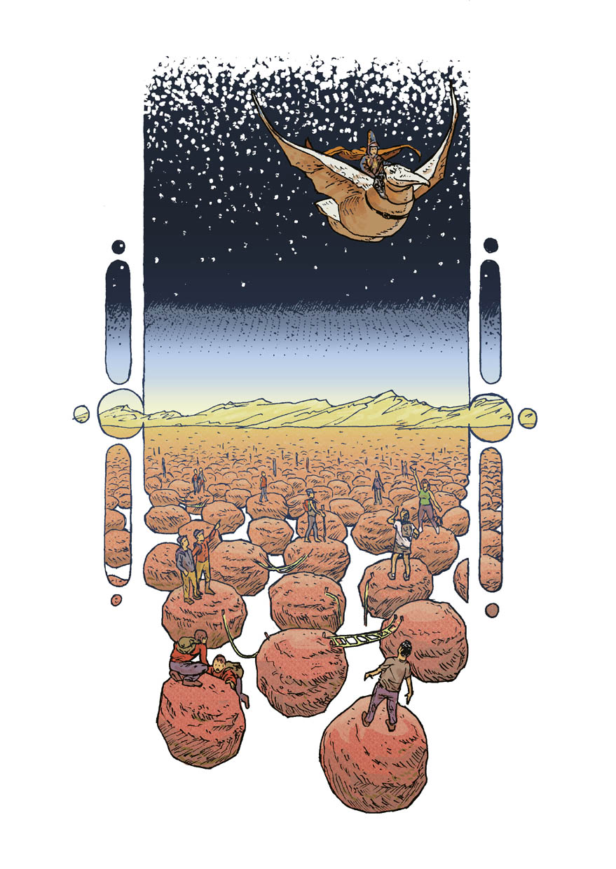 Foi este passado fim-de-semana que este pequeno blog atingiu o bonito número de 5000 visitas :) Obrigado a todos por visitarem e acompanharem-me. Espero que estejam a gostar ;) Foi há três anos e meio que o Fil desafiou-me a criar um blog para divulgar-me e ao Zona. Muita coisa aconteceu, muitas experiências e tentativas, sempre à procura de aprimorar o traço. Muitos desafios, concursos e colaborações entusiásticas. Este blog, penso, é o que melhor me representa, uma porta aberta para as pessoas que quiseram conhecer-me. Para comemorar a ocasião resolvi resgatar uma ilustração que foi criada para participação na pequena homenagem a Moebius por autores portugueses, realizada para o BDJornal. Não só porque o Moebius é um colega das artes visuais, um mestre que inspirou e inspirará muitos artistas. Também porque a ilustração simboliza o árduo trajecto que os artistas percorrem para se superarem. Há os génios: são poucos. Há os talentosos que querem sempre melhorar. E os restantes, que labutam mais; mais dedicação e sacrificios. Somos muitos. Alguns caem no branco vácuo, mas os que persistem serão, decerto, recompensados. Estão a ver aquele gajo ali, no canto direito? Sou eu :)