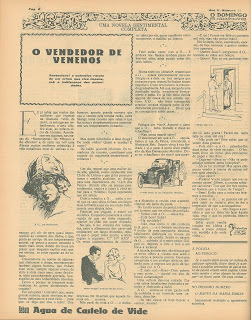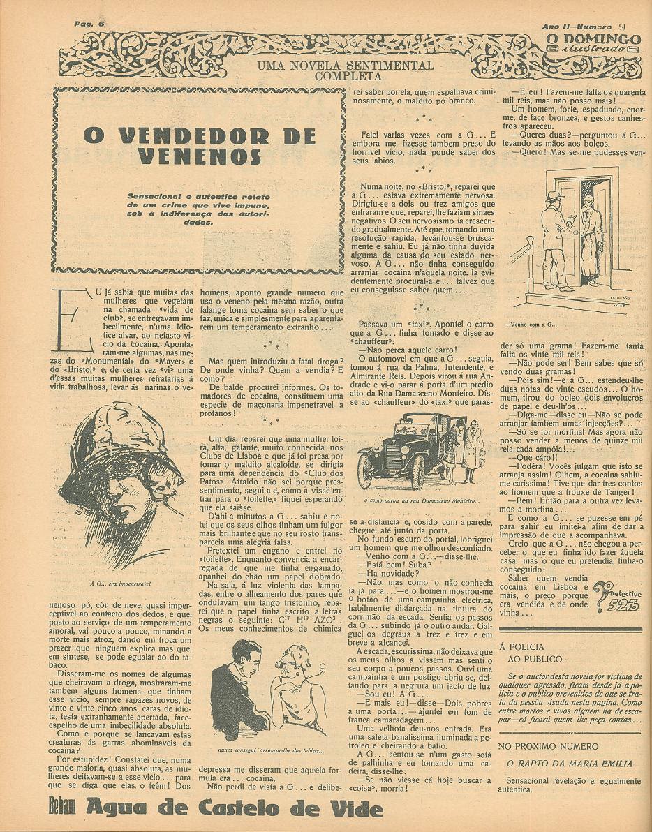 Fazendo pesquisa para o próximo romance, lendo um Domingo Ilustrado de 1925, deparei-me com esta preciosidade: "Eu já sabia que muitas das mulheres que vegetam na chamada "vida de club", se entregavam imbecilmente, n'uma idiotice alvar, ao nefasto vício da cocaína. Apontaram-me algumas, nas mezas do Monumental, do Mayer e do Bristol e, de certa vez "vi" uma d'essas mulheres refratárias á vida trabalhosa, levar ás narinas o venenoso pó, côr de neve, quasi imperceptível ao contacto dos dedos, e que, posto ao serviço de um temperamento amoral, vai pouco a pouco, minando a morte mais atroz, dando em troca um prazer que ninguem explica, mas que, em sintese, se pode egualar ao do tabaco."