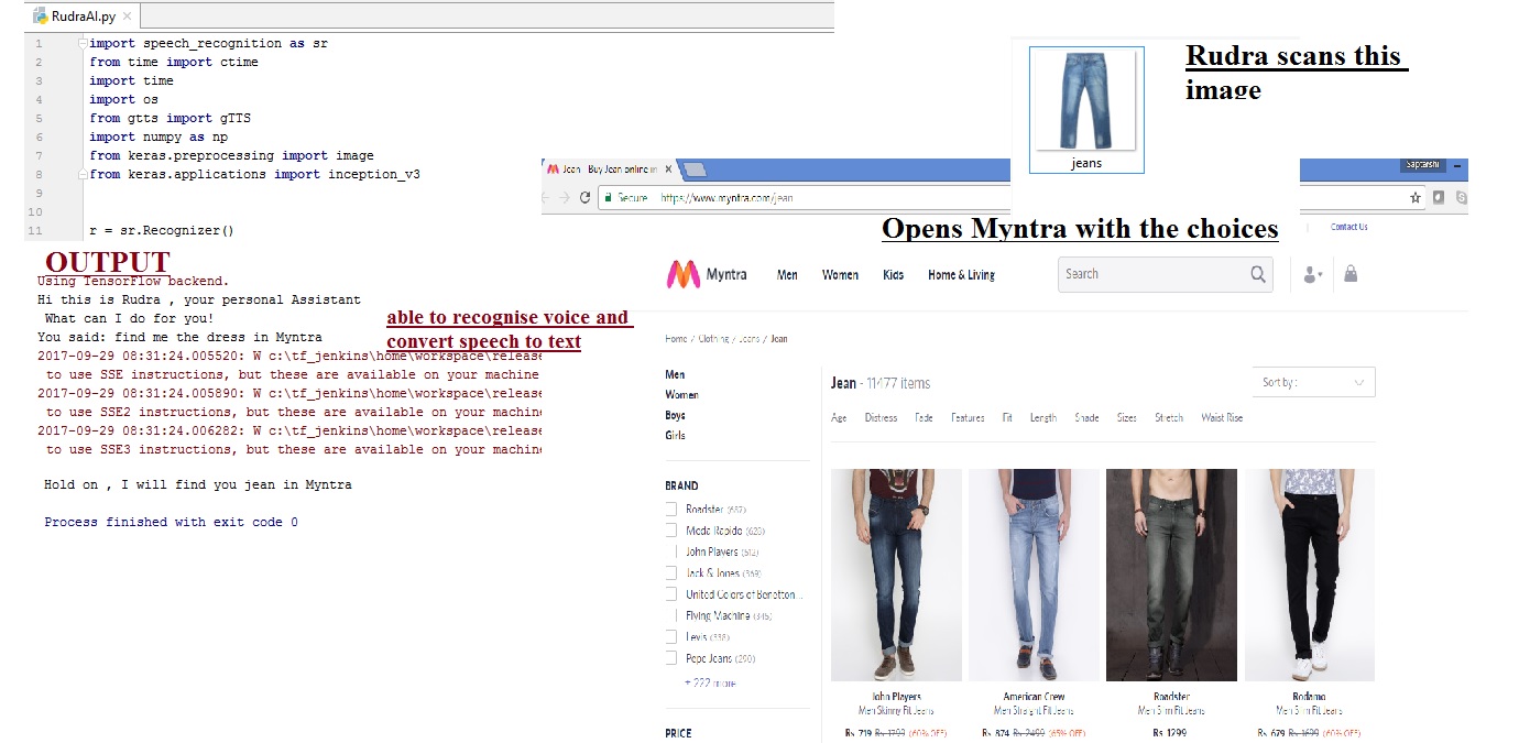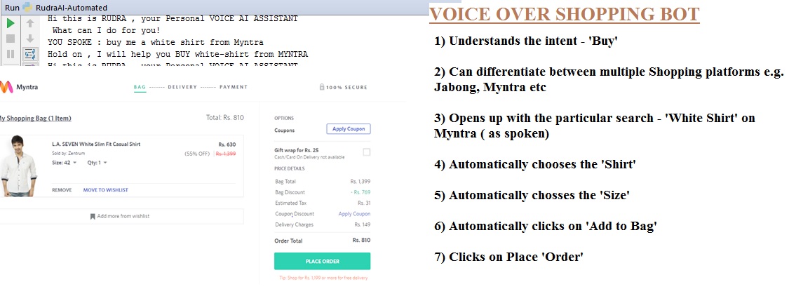 In the 2nd Level, I had tried to make Rudra reaching towards the Goal like buying me an item . For example, if I say -Buy me a white Shirt from Myntra , it first opens up the appropriate search , then selects the item , then selects the appropriate size , adding it to shopping bag and placing the order .