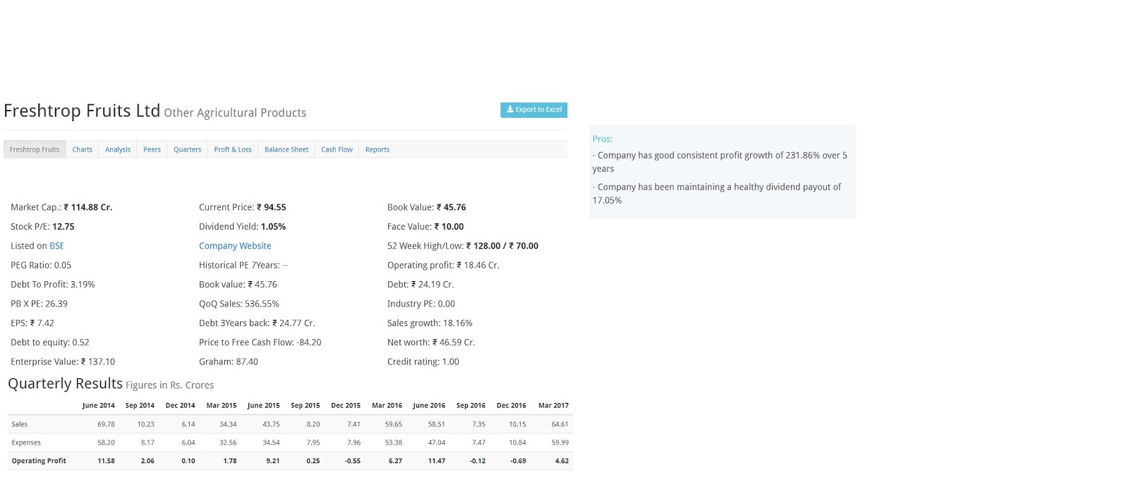 Company posted net profit of Rs 54 lakh, Rs 3.54 crore, Rs 5.65 crore and Rs 7.59 crore for FY12, FY13, FY14 and FY15, respectively. This showed an annual profit growth of over 200 per cent (CAGR) in the past five years. Shares of Freshtrop Fruit have surged 476 per cent in the past five years to Rs 92.10 on December 13 from Rs 16 on December 30, 2011.