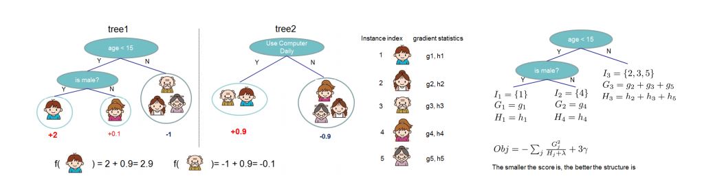 We first briefly review the learning objective in tree boosting. For a given data set with n examples and m features a tree ensemble model (shown in Fig. above ) uses K additive functions to predict the output.