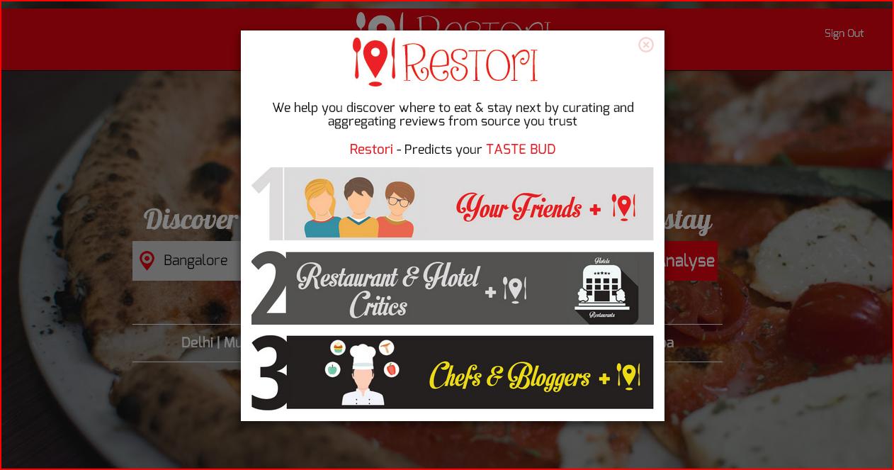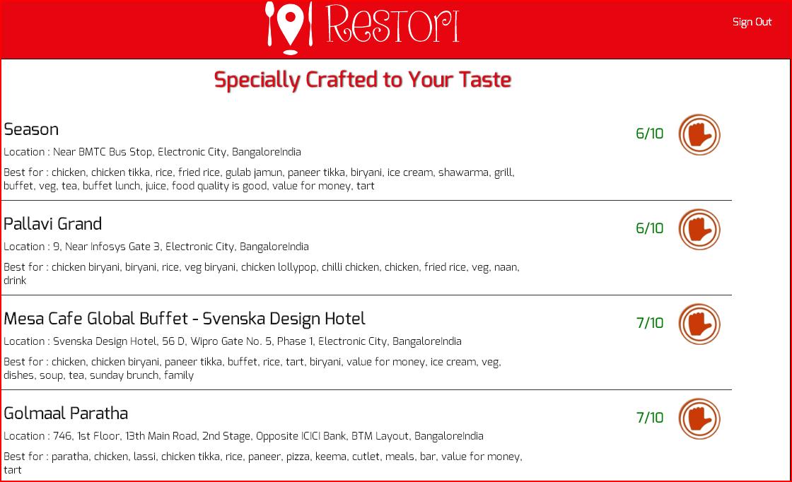 3)Restori understands your behavior,travel pattern , dishes you might like, proximity , time of the day and suggest top restaurants , top hotels and places to travel .