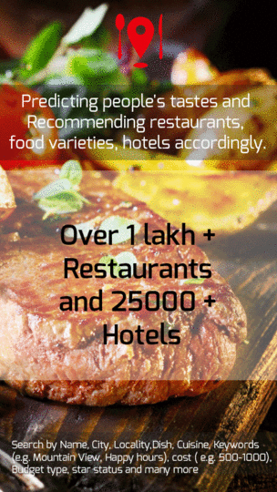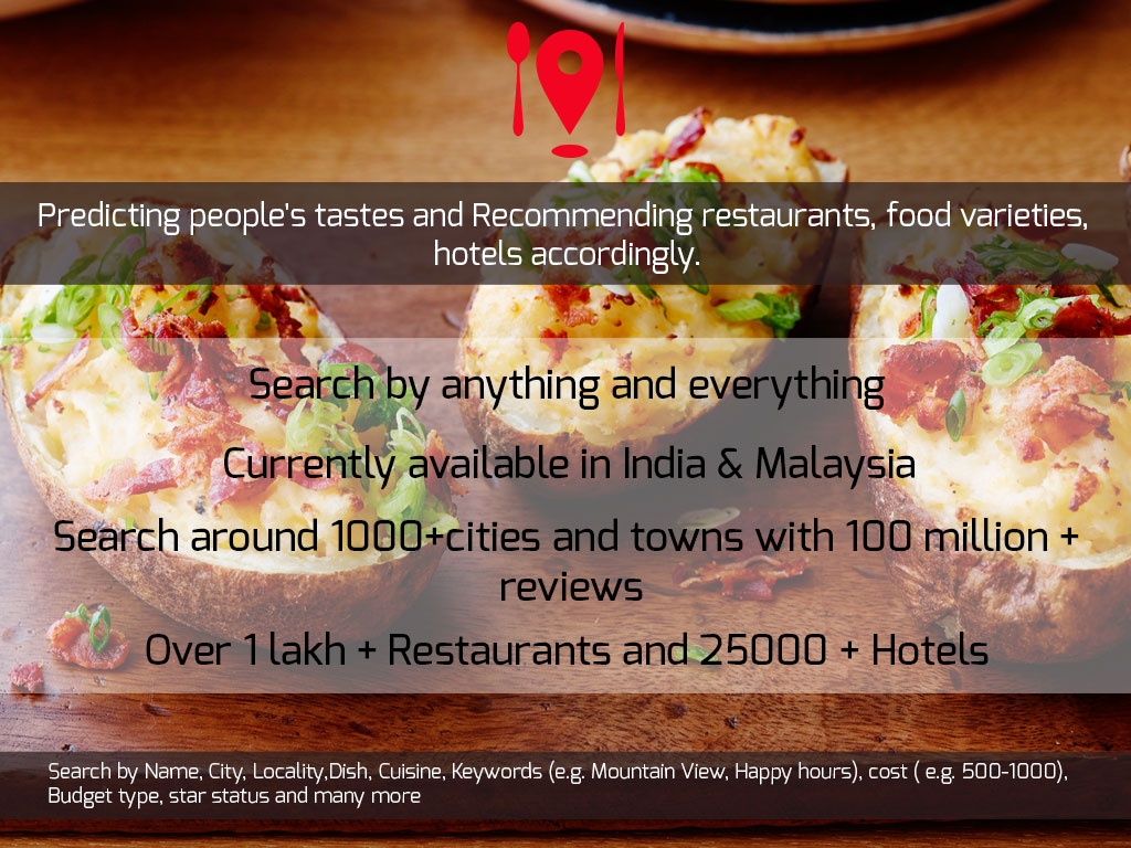 Also, it has an extensive Database of over 1 lakh restaurants and 25000+ hotels across 1000 + cities and towns with 100 million + reviews providing all kind of search.