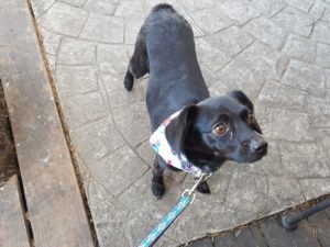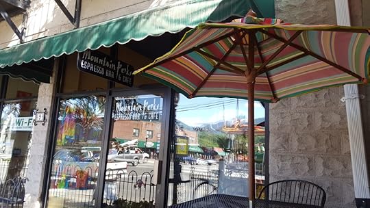 Birdie hoping for a bite of my bagel.A nice tourist comes up and pets Birdie. I watch the other tourists looking at the train and taking pictures. Several squeaky cars drive by because the coffee shop, Mountain Perks, is near the stop light. A service dog comes by and Birdie is offended that he didn’t even see her. She doesn’t understand that the german shepherd is working. At least she doesn’t bark at it. Birdie does turn to me with a questioning look. A woman in the group smiles at Birdie as though she understands the small dog’s confusion.