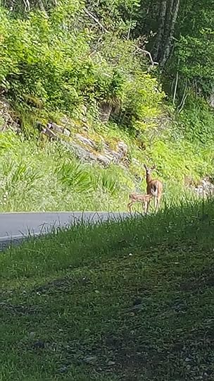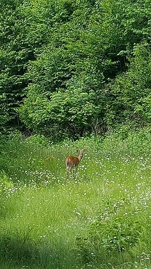 chipmunk. I look up finally to see what attracted her attention. Staring at me is a deer standing still as a tree. Birdie stops pulling once I see where attention goes. I excuse us from the deer’s wood and we go back on the way. Birdie is proud of herself because she didn’t bark and scare the deer. The deer looks far away in the picture, but in person, it felt that it was almost under our nose.