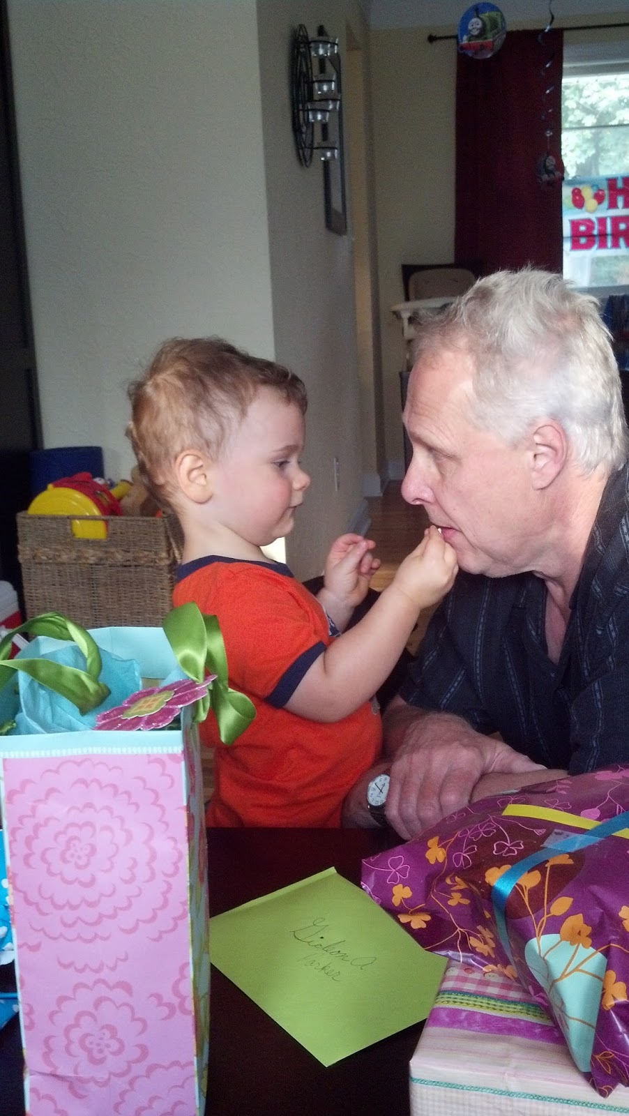 Gideon and Grandpa Dave (My Husband)On Monday, our Grandson by love turned two. How in the world did that happen? It seems like only a month ago that I held him in my arms at seven weeks. Now, here he is, running, galloping, talking...and the baby is no more.
