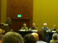 I go to the Breakfast and use my introduction to create THE GREAT WEST COAST MYSTERY TABERNACLE FLASH MOB! Yes, I did. This was a completely foolish idea, to throw away my spotlight...or was it? Everybody joined in and laughed. It was great. I got it on tape an will post it under a Flashmob heading. Turns out all through the day people would stop me and say, "You know, you really stood out during breakfast..." It was great. In one of the afternoon panels I heard people in the row ahead of me talking about it. (Nicely, thank goodness.)