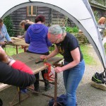 Another job was fitting the oak wood hilt. This is made in two pieces, and is first seared onto the re-heated sword tang, to help seat it. The tang then has four holes drilled, and the hilt fastened with four headless copper rivets. Then the hilt is shaped – more filing and sanding! Finally – a wipe-over with linseed oil.