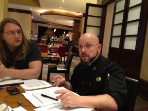 I did get to meet or reconnect with a number of other writers at the Saturday Symposium get-together, among them Mike Stackpole, Jerry Gordon, Geoffrey Girard, Jaym Gates, David Wohlreich, and Miranda Horner and probably more whose names I unfortunately can’t recall! I had a long, fantastic conversation with Maurice Broaddus and Rodney Carlstrom about the business of writing, classic sword-and-sorcery, Charles Saunders’ Imaro, and a host of other topics besides. I’d never met either man before the con and we walked away not just acquaintances, but friends. Finally, I had a blast talking with Scott Lynch and John Scalzi about a host of topics. Those two have such razor-sharp wit that I often feel like I’m sprinting to keep up, but this time I guess I was relaxed enough with them that it resulted in me feeling like I fit right in.