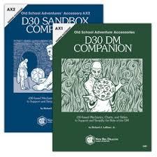 Richard LeBlanc Jr., the genius behind New Big Dragon games, has three essential books: the D30 Sandbox Companion, which has more wonderful tools for putting your campaign together, especially if you’re wanting to design it in a more sandbox way, the D30 DM Companion, which has all kinds of great supplemental material and details for keeping your adventure running, and an alternate monster manual titled the Creature Compendium that’s become a mainstay of my adventure gaming because it has interesting and original critters that just beg to be dropped into your game. I always keep it handy. But wait, there’s more, because the New Big Dragon web site is chock full of great additional D30 tables – monsters, mythic sites, you name it. And LeBlanc has more stuff in the works, so I keep checking in. Here’s a link to his downloads page, but there’s lots of additional great material that can be downloaded from his blog.