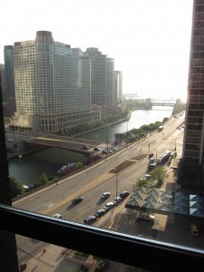 It’s Friday morning here in Chicago and another day of the 70th Worldcon is dawning. James Enge and I ended up with a spectacular view from our hotel room, and my camera actually does it some justice. Below us is a canal, winding its way out to Lake Michican, and the Navy Pier.